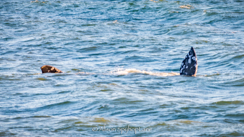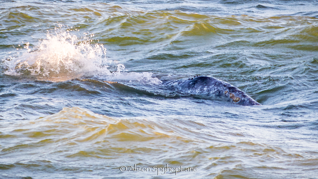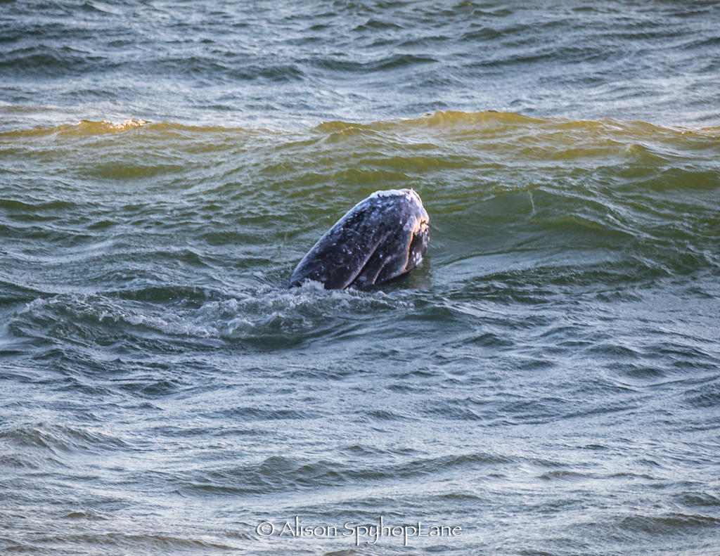 One underweight gray whale observed with neck depressions indicating a loss of blubber and altered body composition. The solo whale was inside the surf line in less than six to ten feet of water. The whale displayed feeding behaviors, headlifts and mini spyhops with sand spewing out of the mouth. Sharking behavior was seen where part of the fluke and part of the flipper or pectoral fin pokes out of the water as the whale swims along the bottom of the sand to feed causing the exposed anatomy to look similar to large shark behaviors and movement. The body shapes from a distance or unknowing observer have been mistaken for sharks.