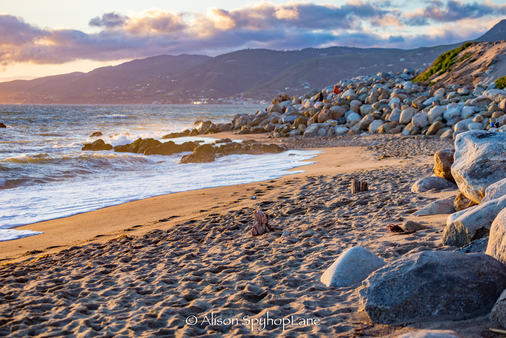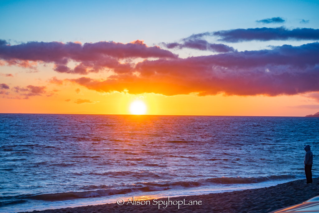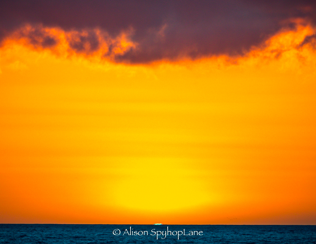 Green flash at sunset. Pylons visible again in the little (small) point area where the new rip rap wall filled in the massive erosion earlier this winter. High winds and rough surf with ongoing changes in weather patterns is making it hard for the sand to fill back in this year.