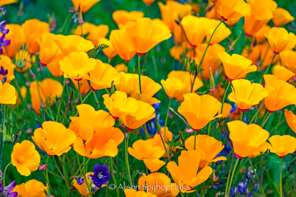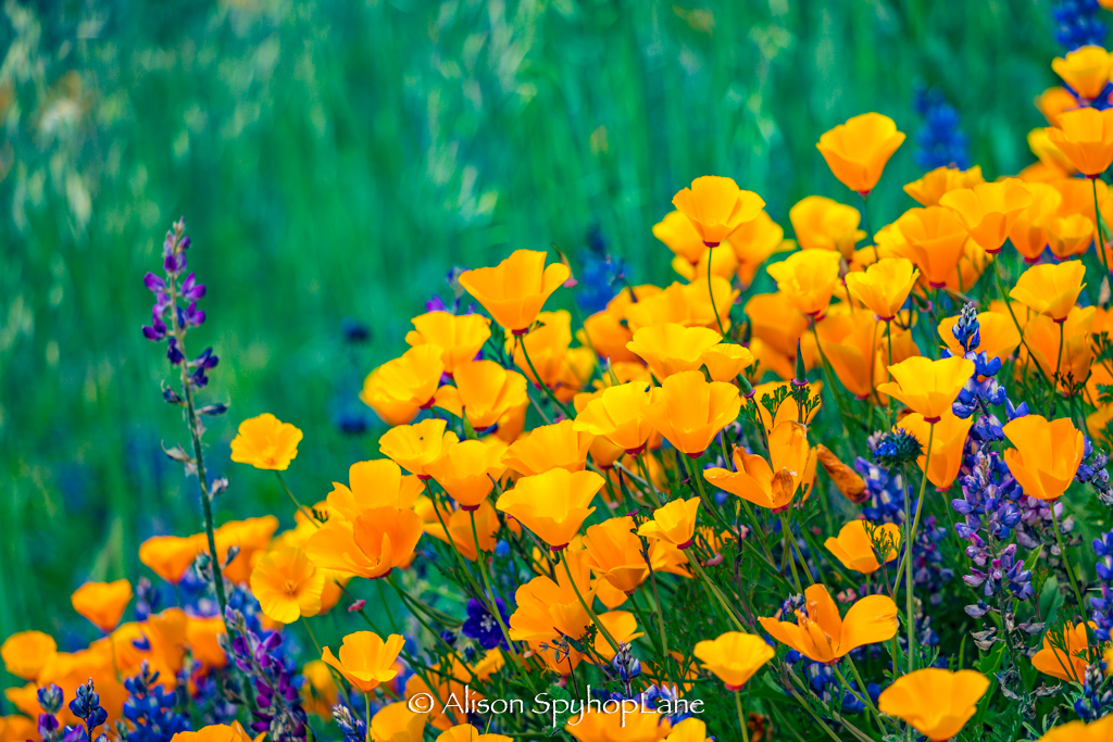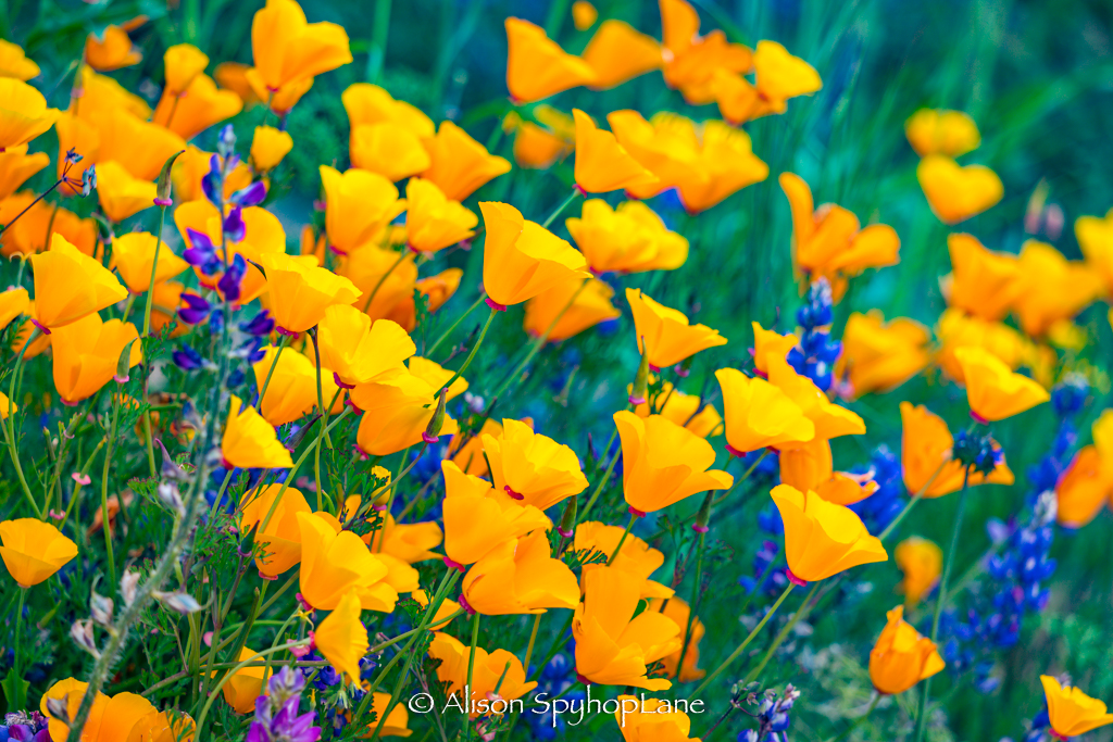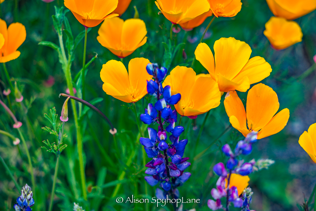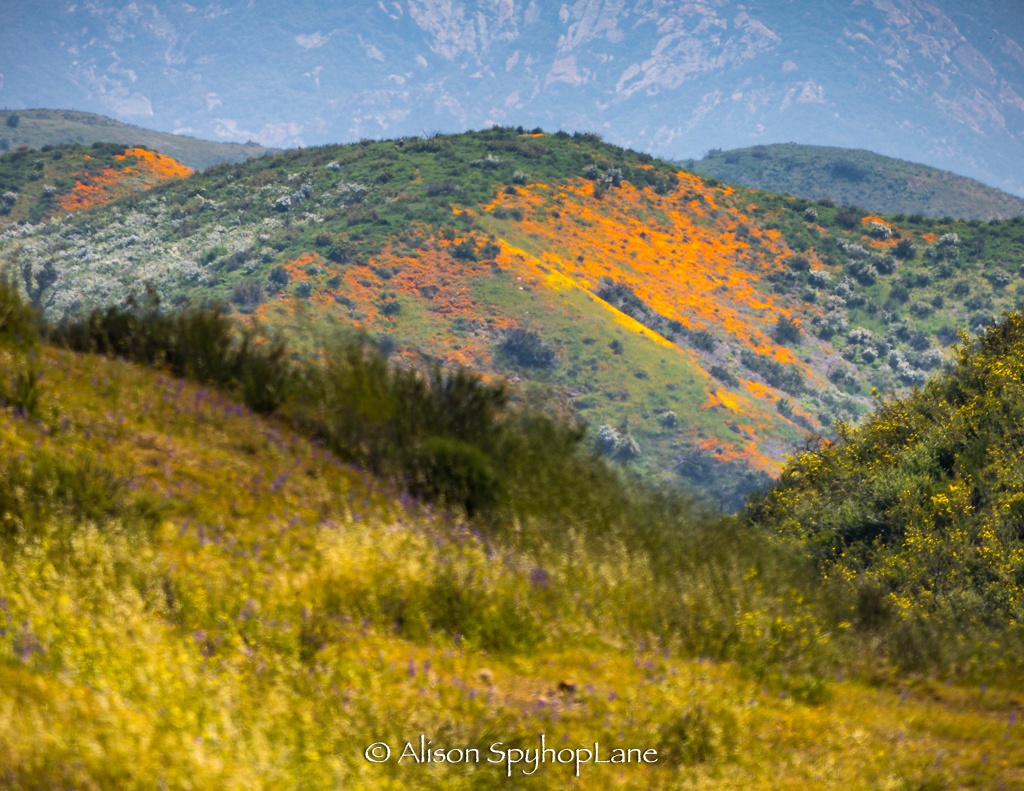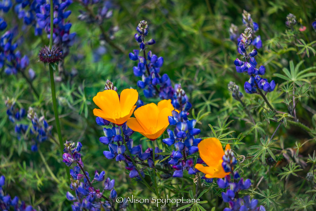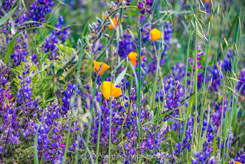 Wildflowers are abundant along the hills and canyons roads in the Santa Monica Mountains. The cooler temperatures and ongoing marine layer and drizzly weather have contributed to vibrant display of colors at a prolonged rate of time. The lupine started blooming in February and have tripled in volume and size. Wild oats and wheat fill in along fields with fiddlenecks, sage and other native plants.