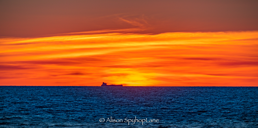 Bright orange skies after sunset as a cargo ship nearly aligned with the last bit golden light.