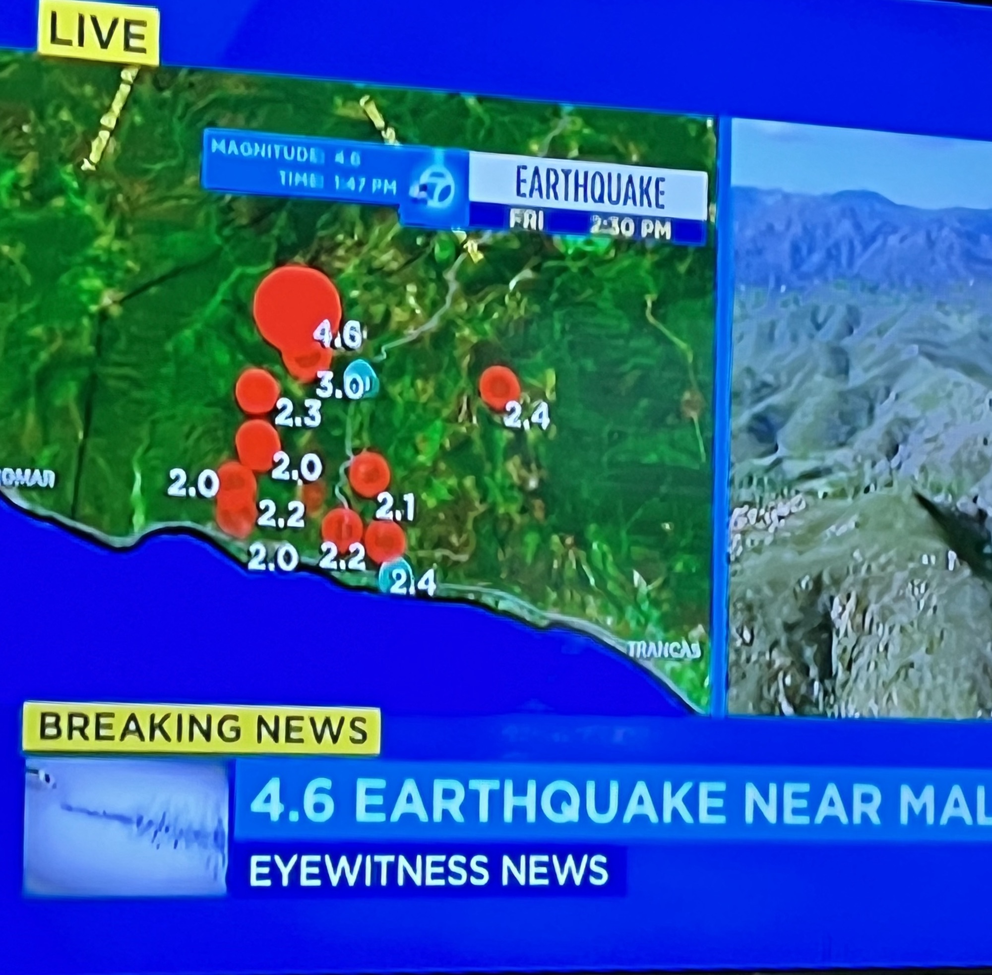 A 4.6 Earthquake struck at 1:47pm near Leo Carrillo in the Santa Monica Mountains. The Epi-center was six miles from Point Dume State Beach. Shaking was not felt personally but was felt by others at the beach who were in moving cars and resting in upper deck of campers. One observer was in the Nature Preserve watching over 100 sea lions hauled out under the bluff resting on the rocks and suddenly 60% lurched up and into the ocean and the remaining stood still at the edge of rocks not going in but frozen in apprehension! The observer did not feel the earthquake personally.