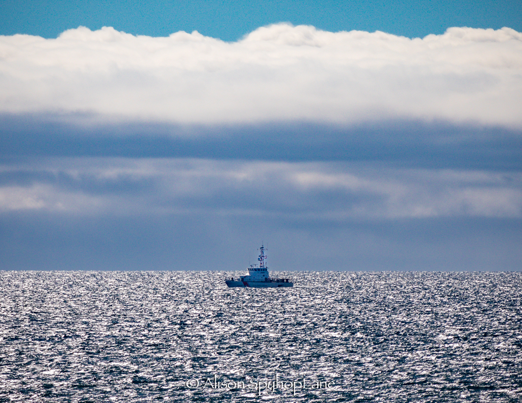 No gray whales observed today despite adequate conditions. Cloudy overcast morning with flat calm seas led to windy partly sunny skies and choppy seas mid day. Dark stormy clouds loomed at the horizon near sunset as an unidentified large military ship could be seen with bright lights moving at high speed leaving a large wake just under the thick cloudy marine layer. A Coast Guard ship, Coast Guard helicopter, large Naval plane and Marine helicopter were also seen in different locations throughout the day. A civilian bicolored plane also flew by at a low altitude in windier conditions while Baywatch Malibu was heading back to port.