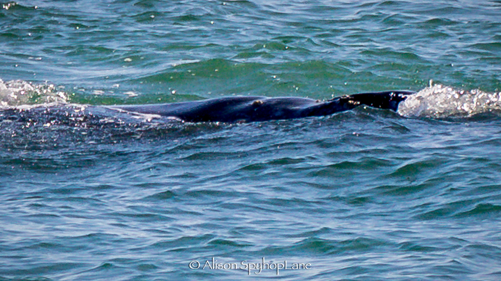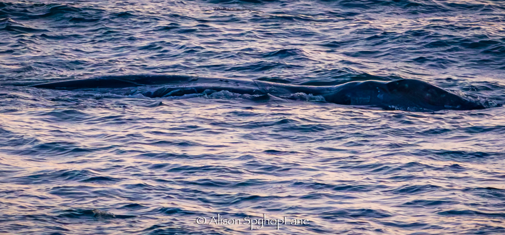 Severely Emaciated solo Gray Whale observed at sunset with two dips in the post cranial neck areas with protruding scapula bones, bulging rib cage and sunken dorsal spine where a thick layer of blubber would be. This whale stayed well past dark slowly traveling through the transect.