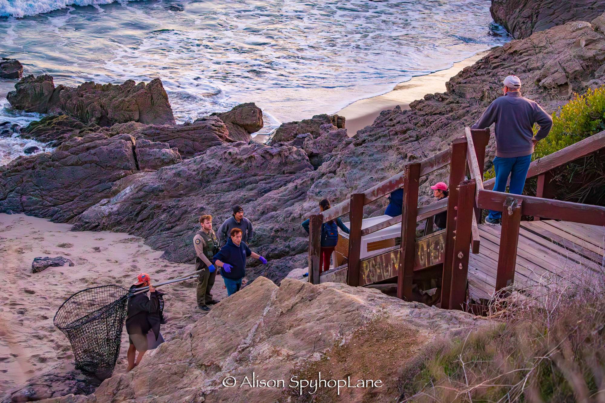 At sunset at Leo Carrillo State Beach, the California Wildlife Center’s van was observed and a Marine Mammal Rescue was in progress with the team on site and sea lion in net. The Sea Lion was observed by onlookers to have odd head movements appearing disoriented and fell off the rocks. Last night the same onlookers were present when another Sea Lion displayed similar behaviors and the MMR team suspected Domoic Acid poisening which is a neurotoxin and without immediate care at risk of death. The Domoic Acid comes from red algae blooms that small fish and shell fish consume. The sea lions in turn eat the fish and become sick. As the MMR team was leaving another call came in about another Sea Lion found with similar issues.