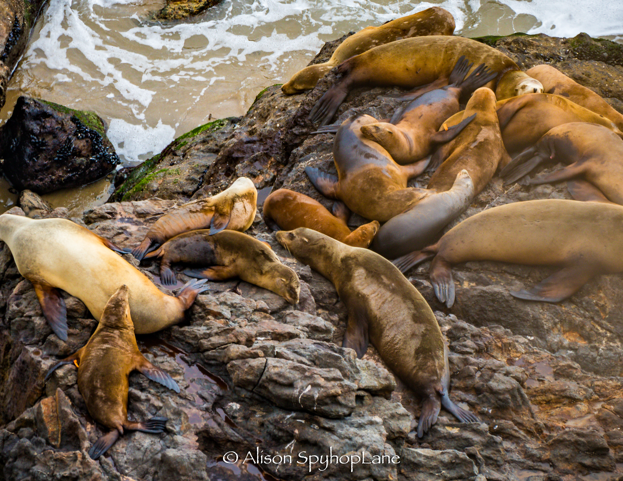 Two Sea Lions (pinnipeds) observed in Sea Lion Colony at the Point Dume Natural Preserve with orange tags indicating that have been Rehabilitated in a Marine Mammal Center. Unfortunately the tag numbers could not be read due to the position the Sea Lions took while resting on shore. Local beach goer Ralph is taking time to view the Sea Lions on his daily adventures.