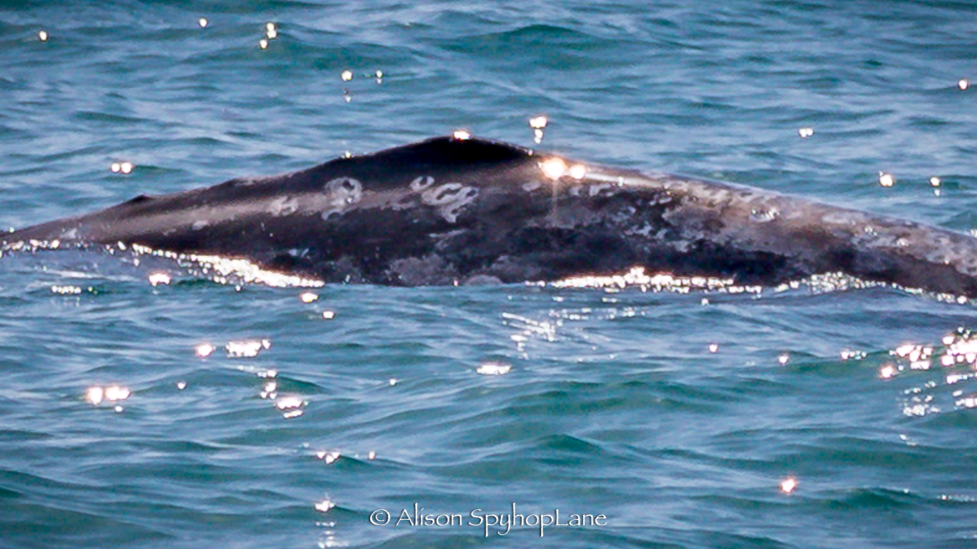 One Gray Whale with a large white rimmed injury filled with whale specific lice: Cyamus scammoni (only found on Gray Whales). The lice only feeds on dead skin, keeping the wound clean and healing. The lice is not a parasite but it is in a symbiotic relationship that is beneficial to both.