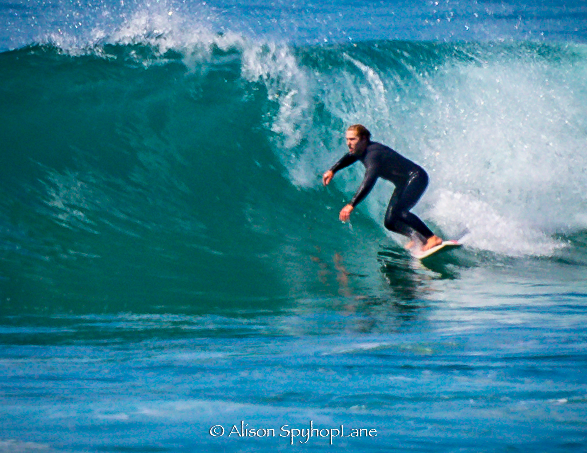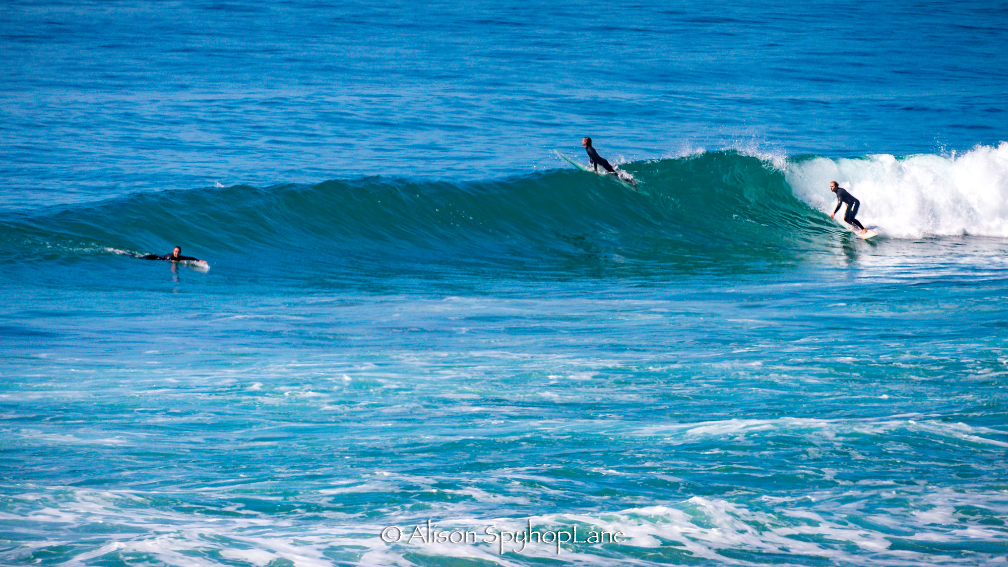 Surf was “up” for local surfers out catching waves today. Local wildlife and whale enthusiasts, Eric Pierson and Richard Corman, looked on.