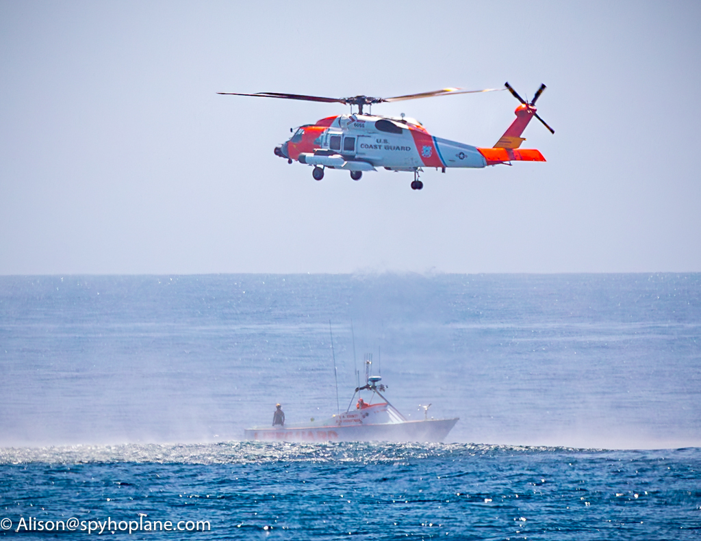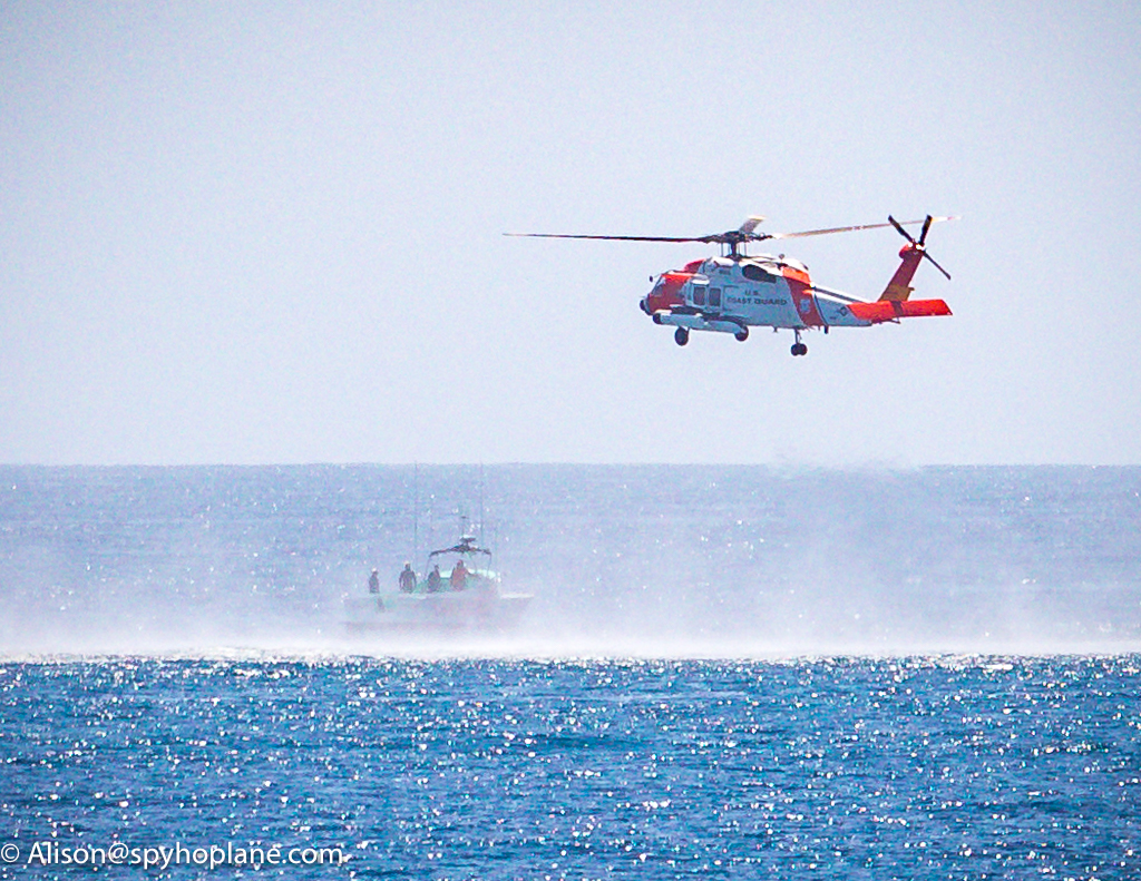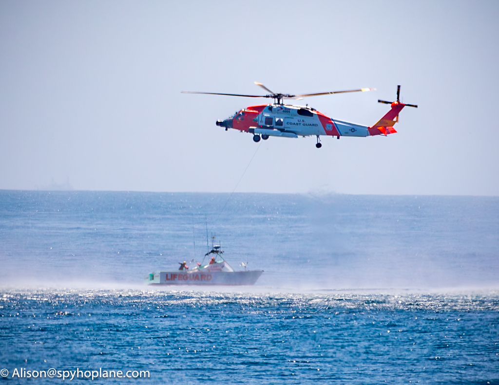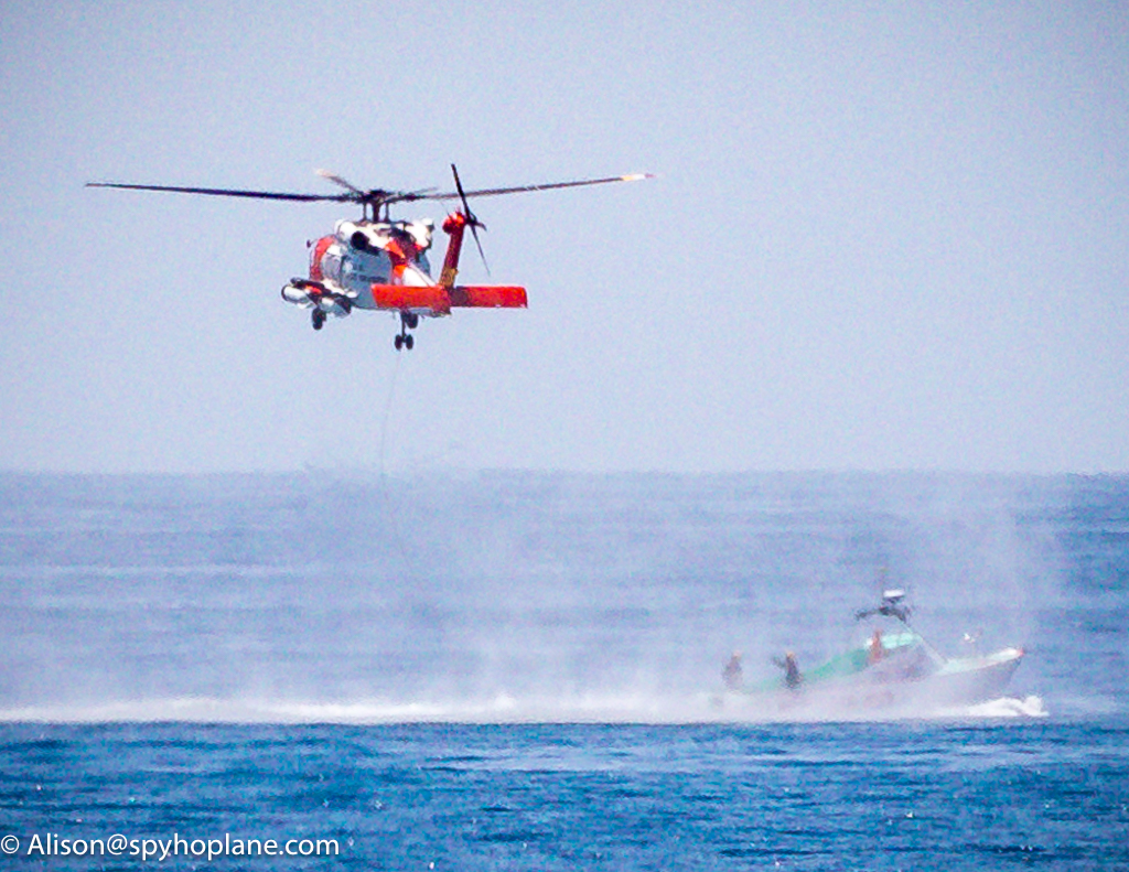 The LA County Ocean Lifeguard Specialists practiced ocean rescue skills with the Malibu Baywatch boat and Coastguard helicopter for 2.5 hours today. First observed south of Point Dume, off of Paradise Cove area. The drills were executed with supreme efficiency and extremely important but the noise level can be startling. The sight is both impressive and frightening with the large wind driven waves rocking boat as cable lines with hoist hooks are dropped from the hovering helicopter directly above or next to the boat as baskets are shuttled up and down. I can only imagine how the team felt working in such treacherous conditions let alone the marine wildlife who endured the 2.5 hour disruption today. The bravery and tenacity of the team to become proficient is not to be overlooked. It is a privilege to witness such displays of heroism and strength just to practice. The exercises drifted north towards Point Dume, in and out of proximity to the coast.