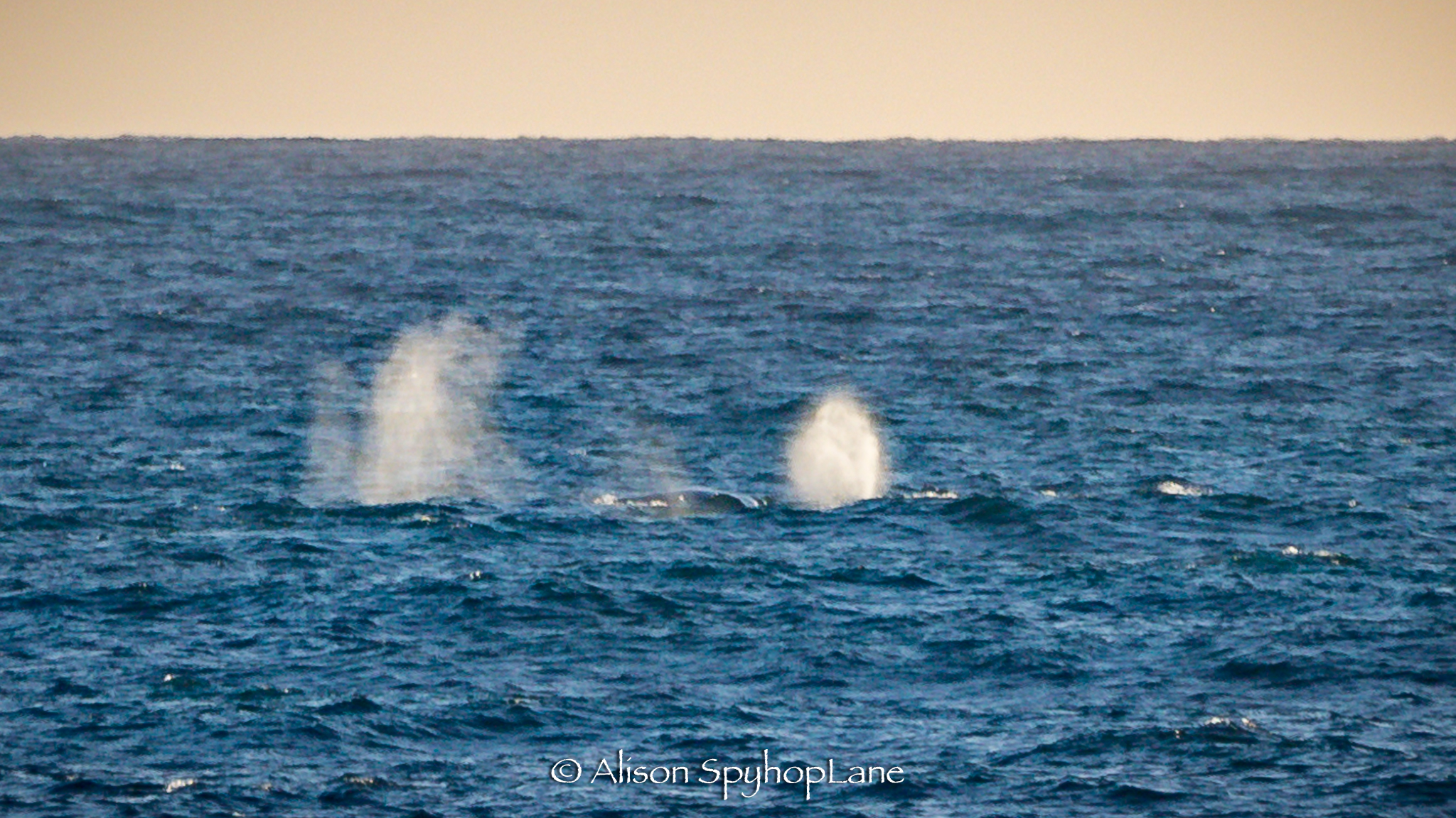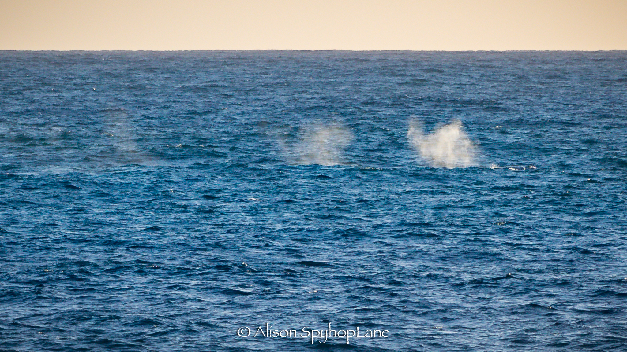 The fifth sighting: FIVE Gray Whales! A TRIO traveling with a PAIR migrated through quickly on the same path heading out along the sun-line to deeper seas. Not all the whales exhale at the same time producing visible blows. Confirmation of five whales swimming top speed by drone pilot with limited footage due to high wind warnings.