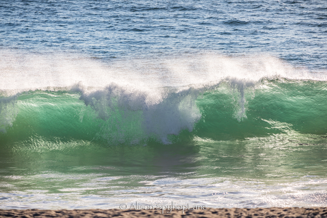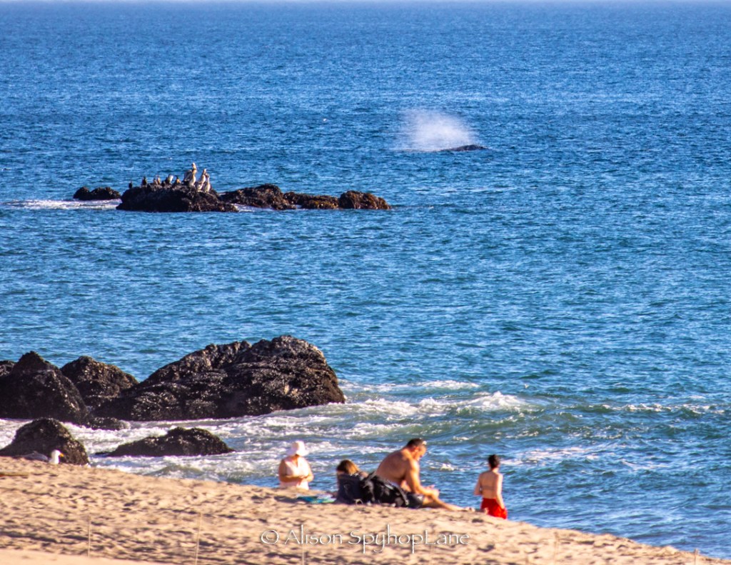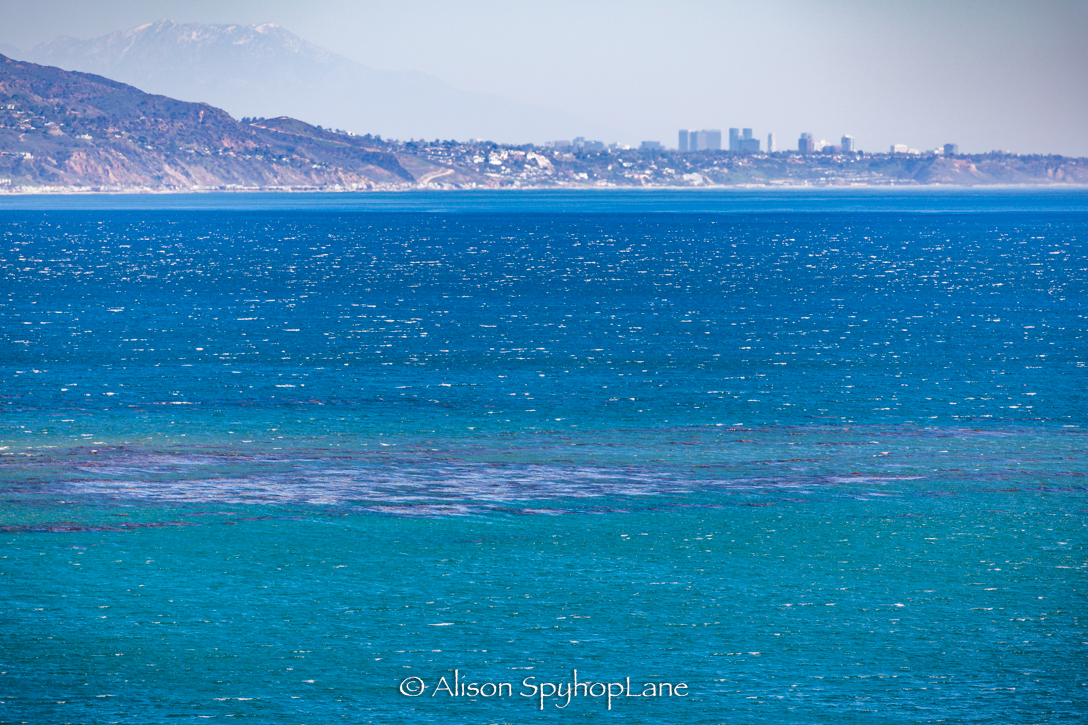 Bright Sunny skies, 73 degrees warm day with gusty 17+ mph off shore Santa Ana Winds. White caps across the Santa Monica Bay. Ancient Giant Coreopsis in bloom along Poppy Lane in the Point Dume State Park. The new staircase at the park into Big Dume Cove is currently shut down due to massive sand erosion of the cliff during the recent winter storms. Sea Lion Cove, is filled with over 25 hauled out Sea lions. Later, photos revealed one has a visible rope entanglement injury (photo below). Will update this post after checking in with California Wildlife Center who rescues injured or sick marine mammals. The first and only whale sighting of the day was four hours later with a trio traveling in a tight group with two up front and one slightly trailing. All looked healthy. Later a stampede of very active sea lions hunted a massive bait ball 500 yards off shore out side of the buoy at Tower two. The wind died down to 7-10 mph later in afternoon leaving sea spray in the 2-3 ft waves. Temperature dropped to 63 degrees which felt much colder with the wind chill (ha ha :)) A small sliver of a green flash seen at sunset.